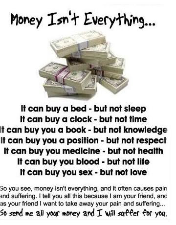I guess, to each his own. Yes money isn't everything, but its still something that eveybody in the world recognises as a symbol of power, a mean of survival, or even as something so scarce and unattainable. As the world progresses, more people become more aware of the importance of money. They compete, they backstab, they do all sorts of unthinkable things, just to have more money than others. But will they be happy from doing so? Even the intention of donating to charities are wrong. Must they use Condos, Cars, Cash as prizes to attract people to donate? Have they thought about it? About what the needy recieving the donations are from people who donated not because they really wan to help, instead its because of the irresistable prizes?